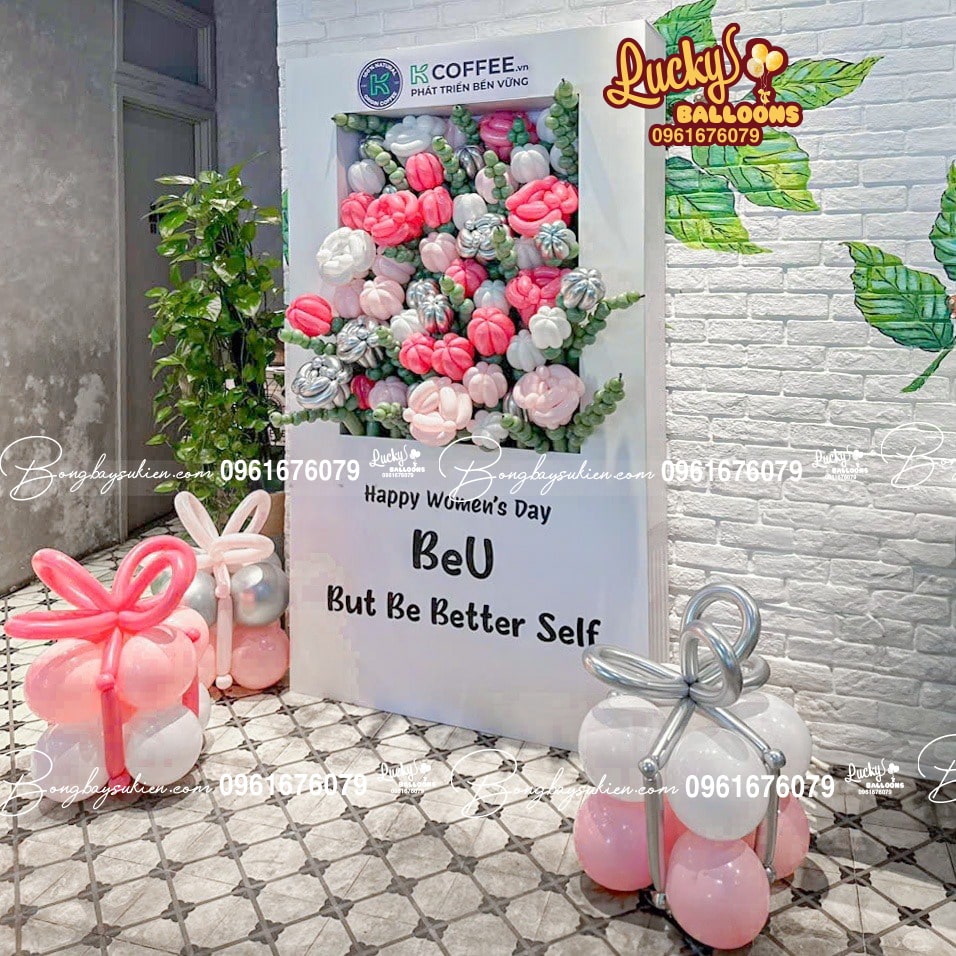 Background check-in sáng tạo: Một backdrop với dòng chữ "Happy Women's Day" bằng bóng bay chữ, kết hợp cùng các chi tiết như bóng bay trái tim, ngôi sao, hoa lụa sẽ là điểm nhấn thu hút, nơi mọi người có thể lưu giữ những bức ảnh kỷ niệm đáng nhớ.