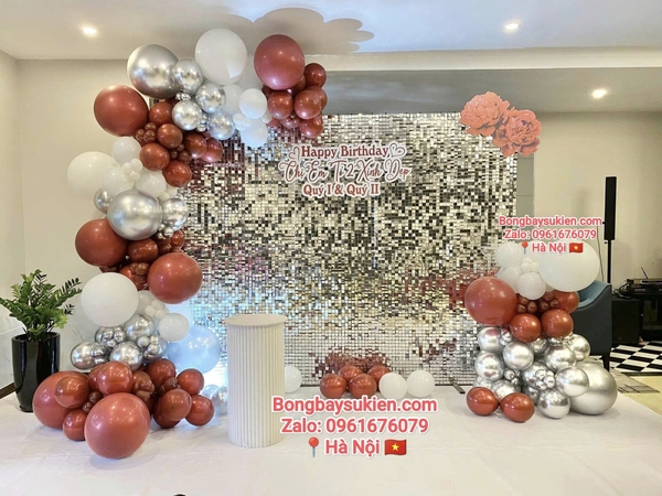 Phong cách Sang trọng & Tinh tế: Sử dụng tông màu kim loại (vàng đồng, bạc, rose gold) và bóng bay pastel cao cấp.