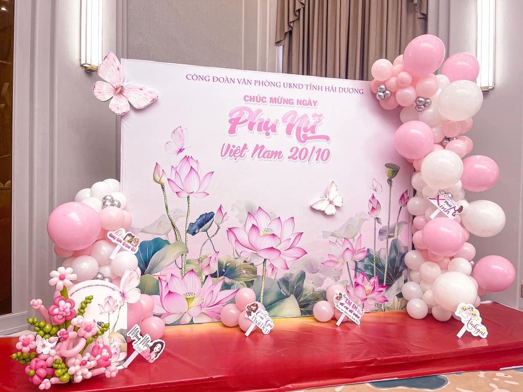 Thiết kế backdrop sang trọng, in logo công ty, slogan riêng. Phù hợp tổ chức mini event, chụp ảnh lưu niệm, trao quà cho nhân viên nữ.